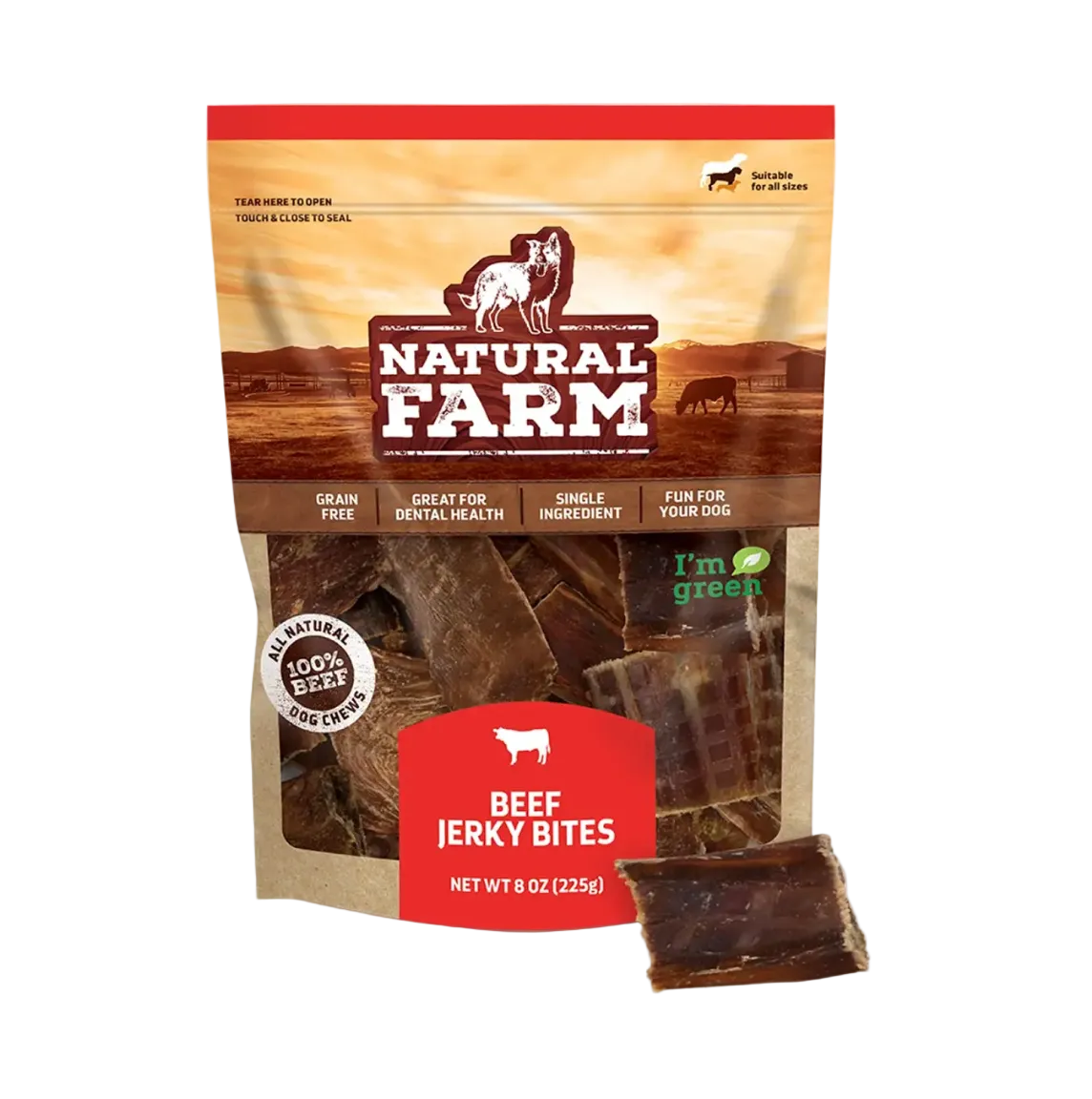 Natural Farm Beef Jerky Bites Dog Treats are an all-natural treat that supports dental health. This softer texture creates a perfect treat for lighter chewers, dogs with sensitive stomachs, senior dogs, and puppies. A great source of glucosamine and chondroitin to extend joint health, support mobility, and reduce joint inflammation. Fully digestible, no chemicals, hormones, antibiotics, artificial flavors or colors.
